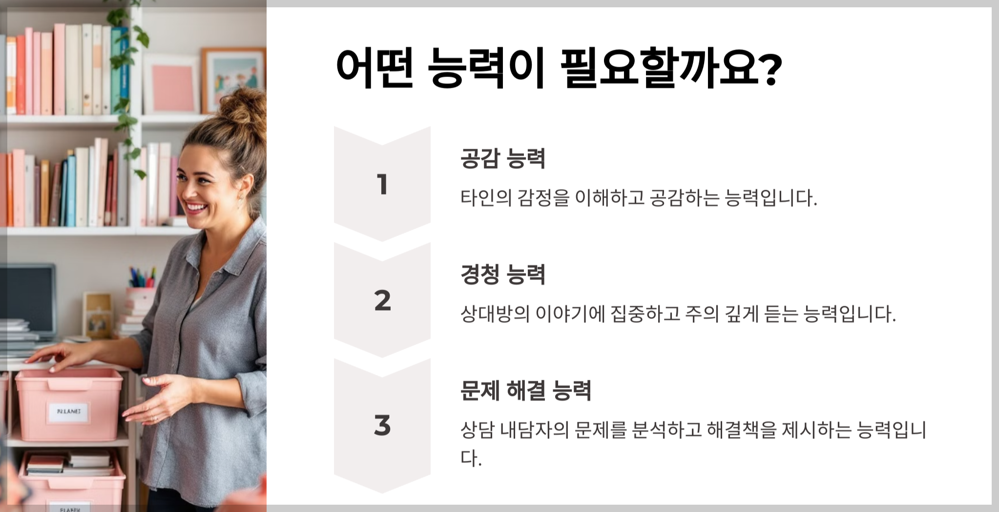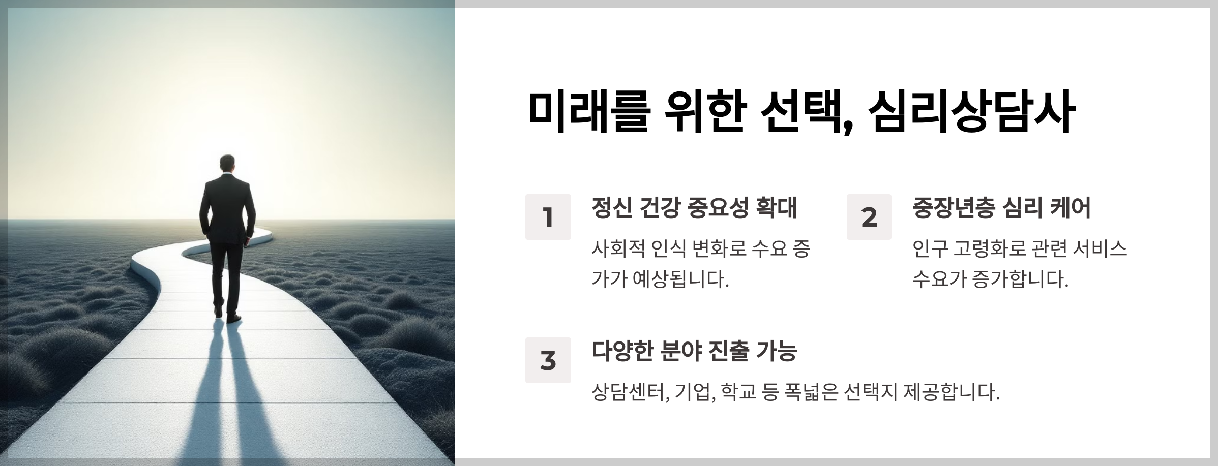 특히 중년층의 경우, "경험에서 우러나오는 공감력"이 강점이 되기 때문에, 나이에 관계없이 심리상담사로 활동할 수 있어요.