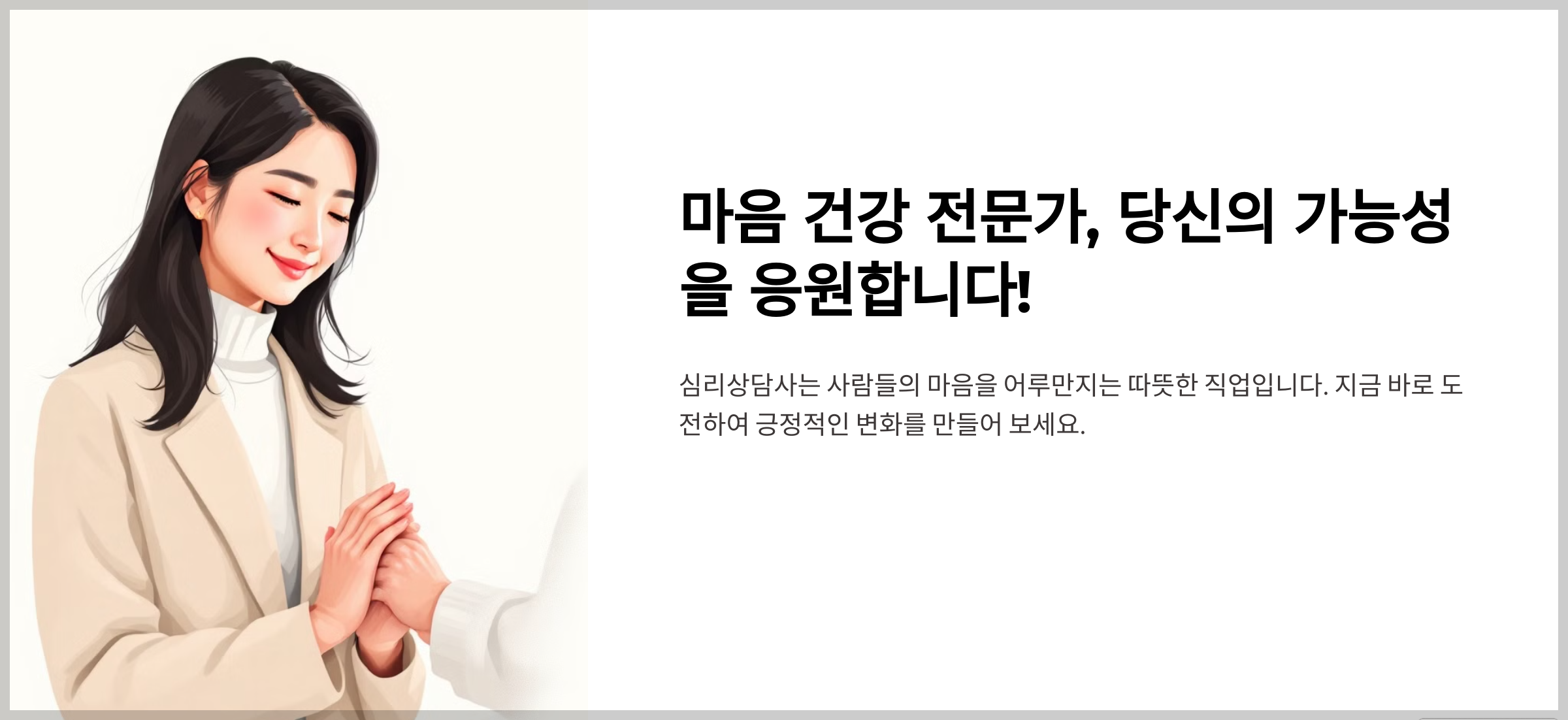✔️ 특히, 삶의 경험이 많은 40~60대는 경청과 공감 능력이 자연스럽게 갖춰져 있어서 심리상담사로서 강점이 될 수 있어요.