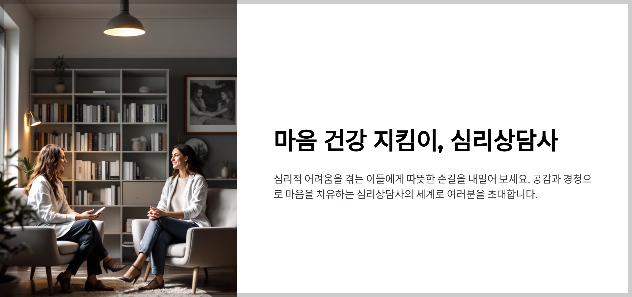 심리상담사는 마음이 힘든 사람들의 이야기를 듣고, 문제를 함께 해결해 나가는 심리 전문가입니다.