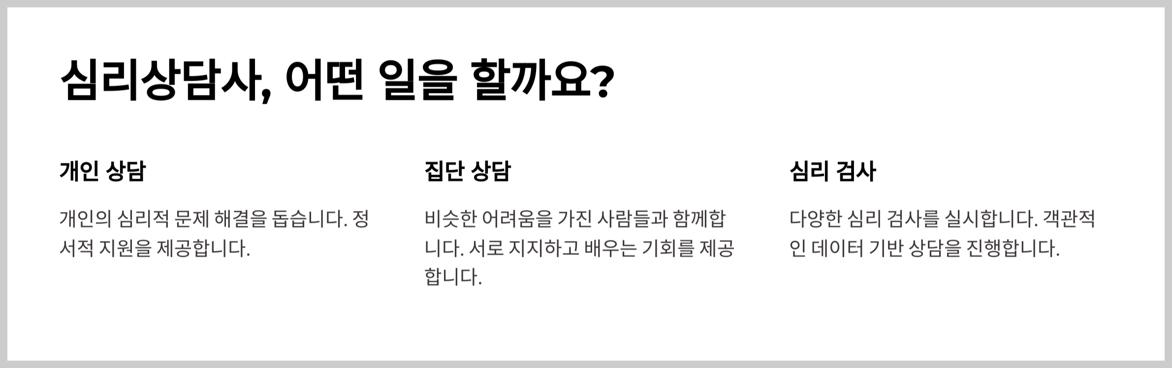 - 심리상담센터 (개인, 부부, 가족 상담 등)